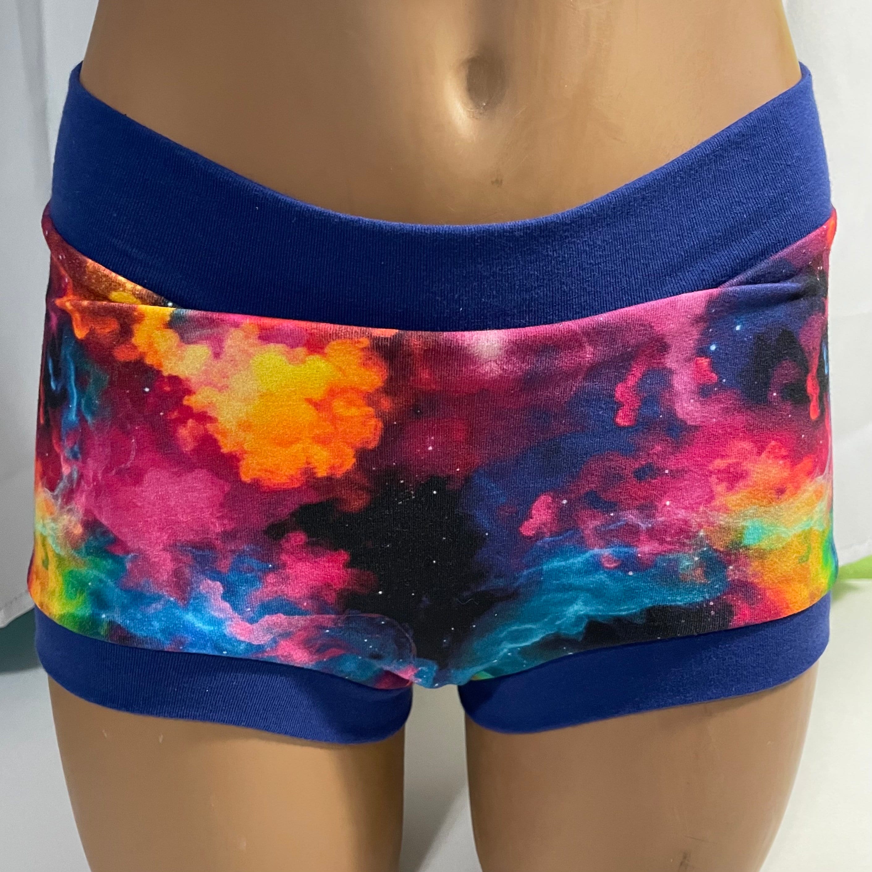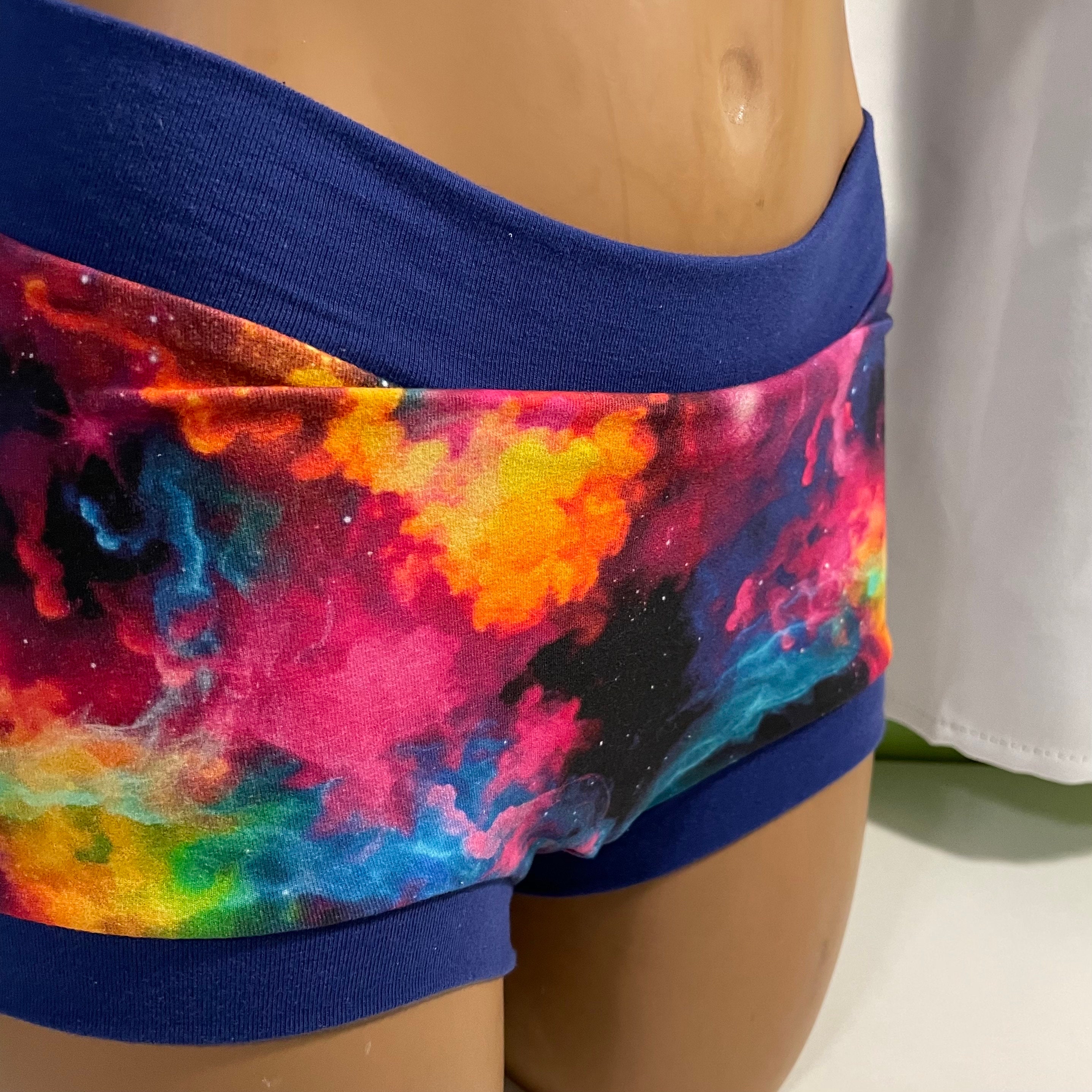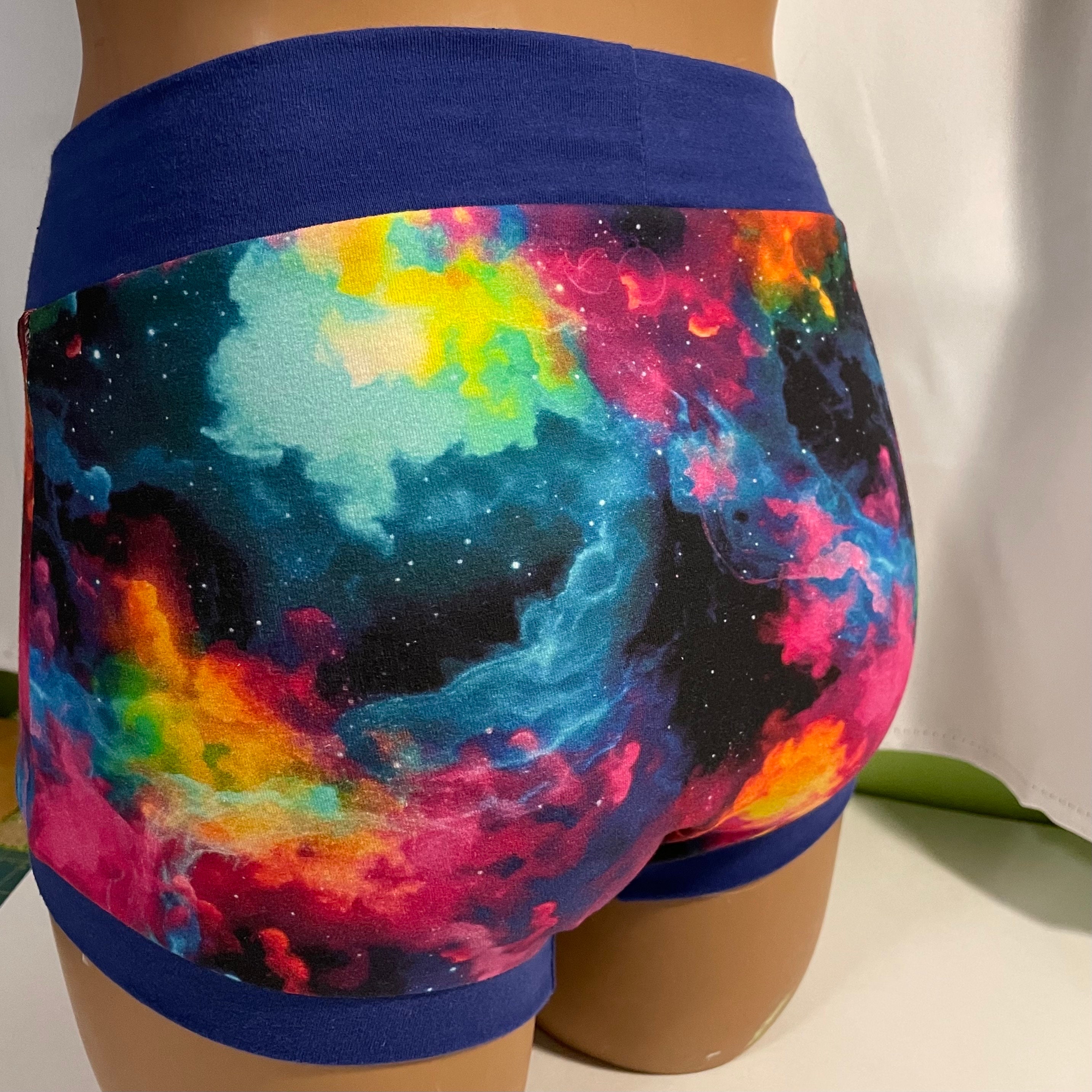 Super soft and comfortable boy short style underwear of stretchy cotton/lycra fabric with soft cotton/lycra waist & leg bands. Beautiful, bright and fun print stretch cotton Lycra patterns. Comfortable yet snug hammock like 2nd layer inside front panel of mid-weight fleece fabric to provide a bit of padding and coverage plus wider crotch to accommodate genitals.
